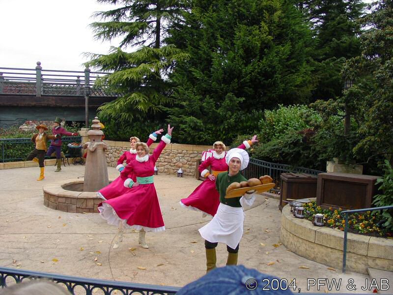 blonde dorpsschonen zingen en dansen onder andere "Be our Guest" en een