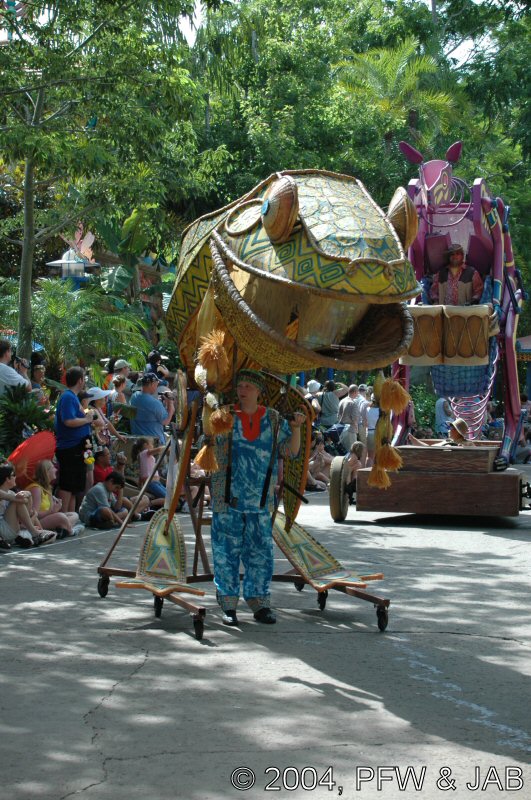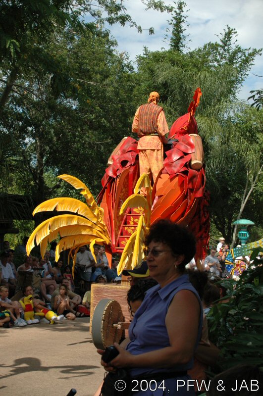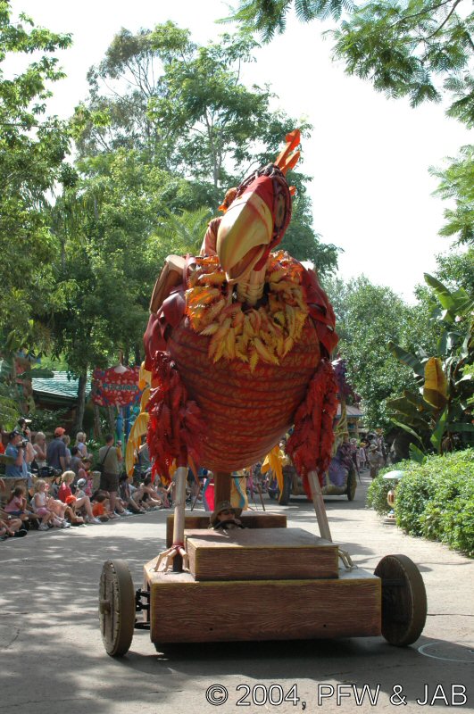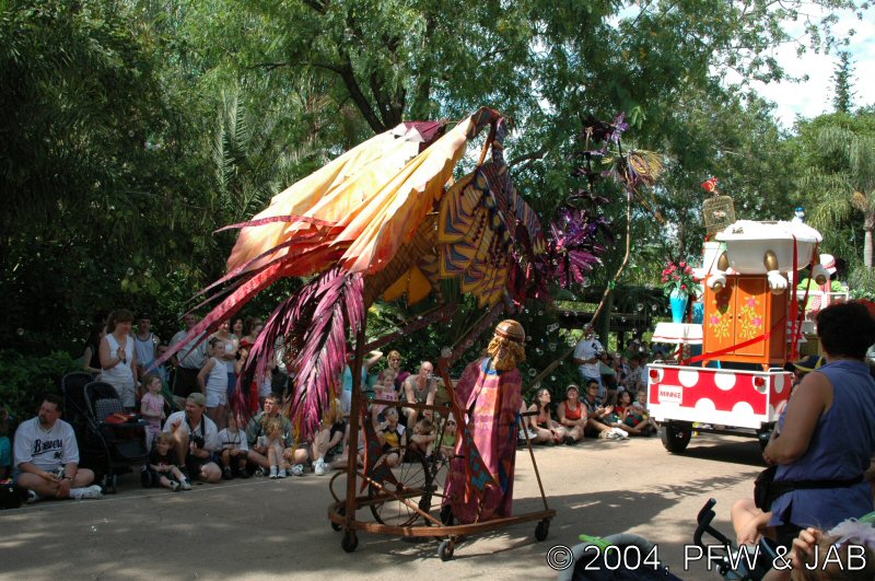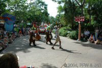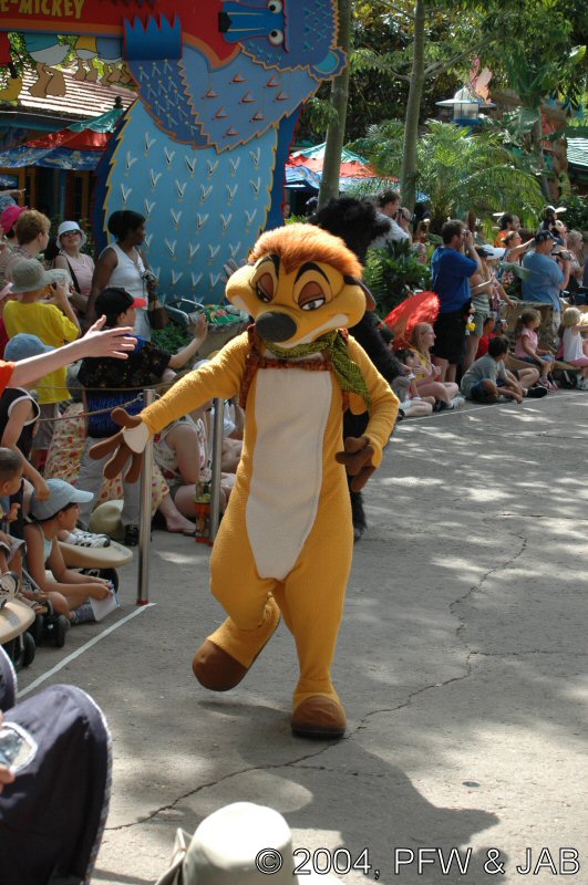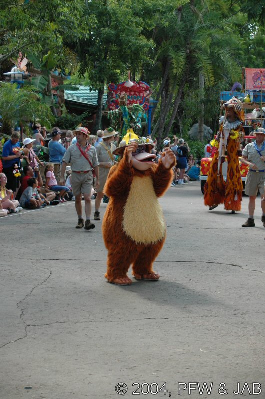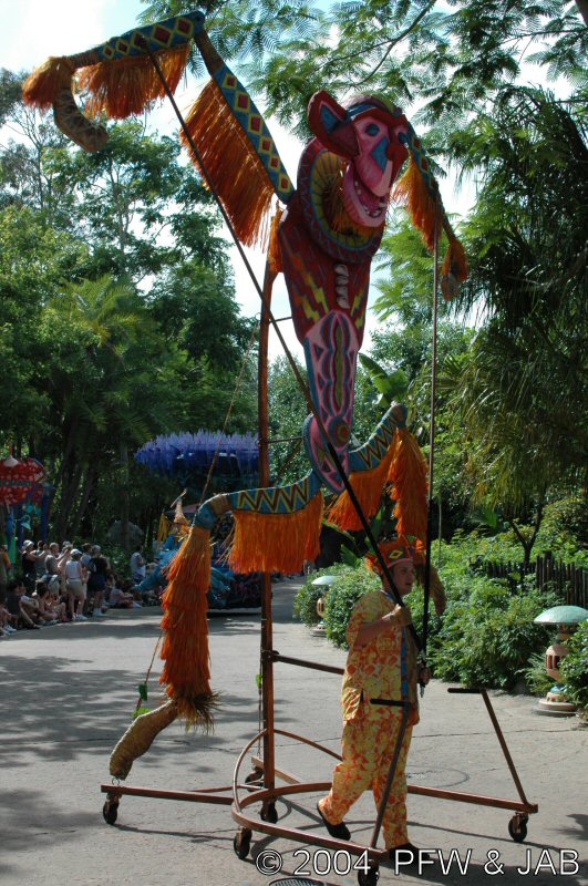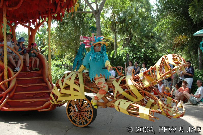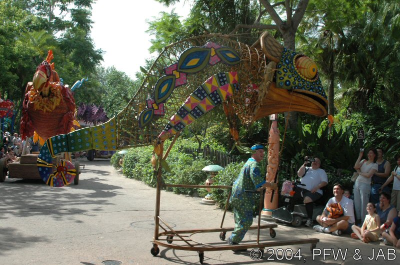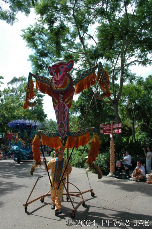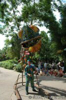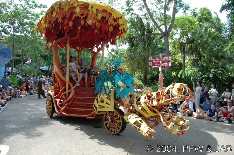 Starts at the Tusker House Gate at Harambe Village. It winds through Disney’s Animal Kingdom and returns to the Tusker House Gate. Concept: With all the sights and sounds of an outrageous island street party, Disney characters have come to town on expedition with a wild, whimsical, larger-than-life tribute to their animal friends. Design Elements: The procession consists of individually designed elements that bring a variety of heights, colors and abstract animal visuals to create a fun, theatrical showcase for the Disney characters. The elements include: five character-based safari vehicles, four drum sculptures, three rickshaw taxis, eight animal puppets, 16 Disney characters, 10 Party Animal stiltwalkers, and 10 Party Patrols. The eight abstract animal puppets were designed by Michael Curry Designs in Portland, Ore., which created the puppets for “The Lion King” on Broadway. Costumes: “Mickey’s Jammin’ Jungle” parade costumes were designed by Matt Davidson. The prototypes for the puppeteer costumes were crafted in Africa by native artisans. Parade costumes were created at Walt Disney World Creative Costuming, Parsons Mears in New York, Costume Armor in New York and Vegas Costumes in Las Vegas. Performers: Features 60 cast members including performers, drivers and coordinators. Highlights: As “Mickey’s Jammin’ Jungle” winds through the park, a menagerie of abstract animal images comes to life in fun, theatrical designs handcrafted from an eclectic mix of natural materials and fabrics. Soaring animated puppets and towering percussive drum sculptures create bursts of living color against Disney’s Animal Kingdom’s dense jungle greenery. Elaborate rickshaw taxis put selected guests in the middle of the parade, accompanied by Disney characters in customized musical safari vehicles. A troupe of 8-foot-tall Party Animals and energetic Party Patrols interact with guests and direct them in the creation of the live call-and-response sing-along music fest. Up to 25 spectators will be selected daily to ride in the opening unit, three guest rickshaws and the finale unit. Guests will be given Kodak disposable cameras so they can capture the special moment aboard the parade. Viewing Tip: In addition to the myriad of characters participating in “Mickey’s Jammin’ Jungle” parade at Disney’s Animal Kingdom, guests can see Disney characters including Pluto, Baloo, Louie, Brer Rabbit, Brer Bear, Timon, Terk and Chip 'n' Dale. I have a tip for people going to see Mickey's Jammin' Jungle Parade at Animal Kingdom. The parade does a loop through the park. There is a portion of the route (near the Safari entrance in Africa) that the parade goes through twice (at the beginning and end). If you get a spot here just before parade starts, you can watch it go by once and then wait ten minutes for it to come by the other way. After the first pass, most guests leave and you have your choice of front row seats without having to line up an hour beforehand. If you have both a still camera and a video camera, this allows you to use both cameras and get some great pictures! Jenn www.AllEarsNet.com |