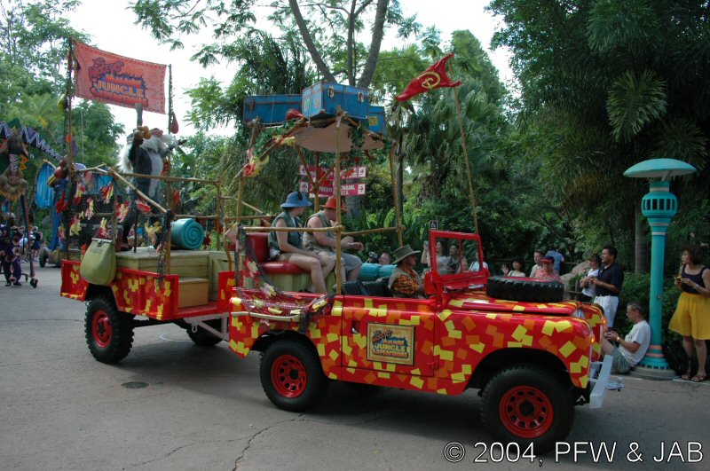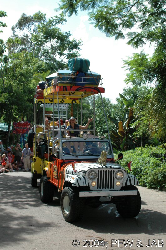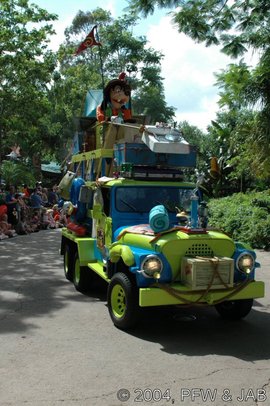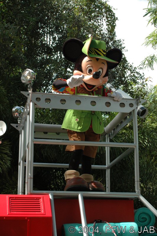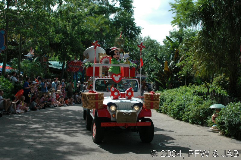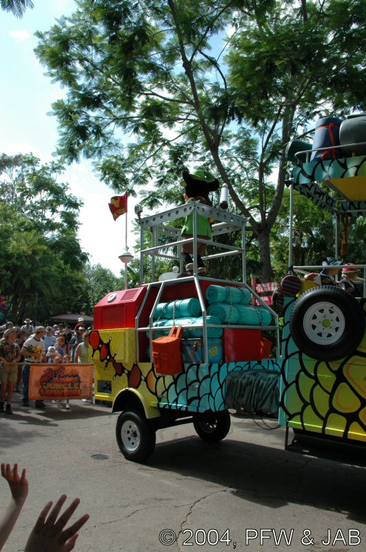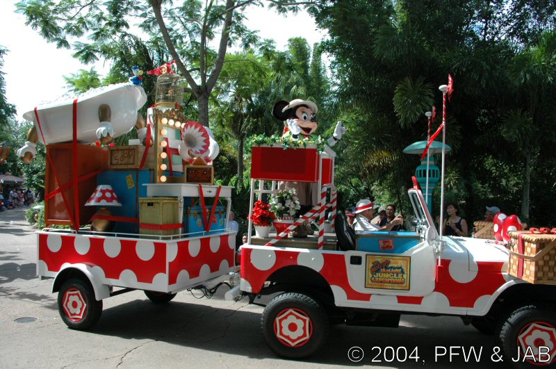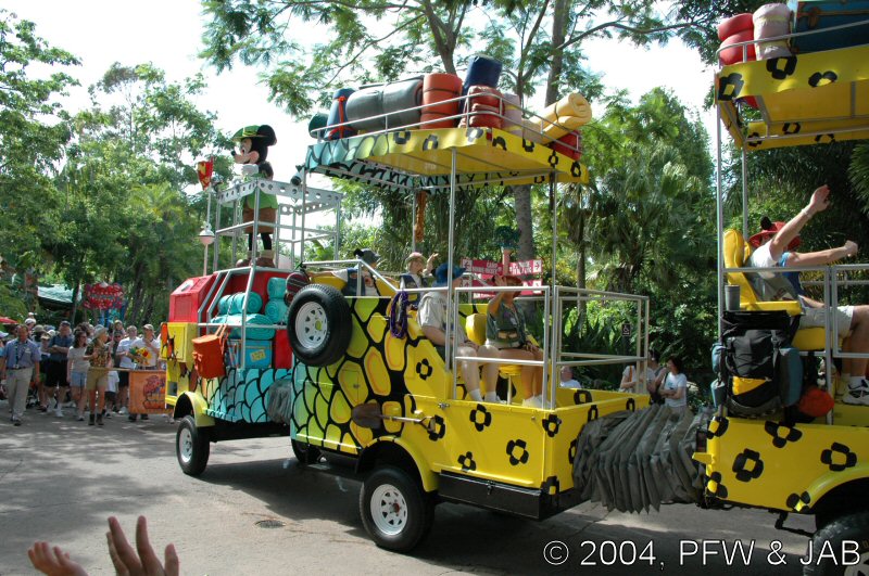 | Bon Voyage Caravan features a brightly colored jeep carrying Mickey Mouse. This jeep pulls a float consisting of several different safari-themed segments. The float carries Mickey Mouse and a guest family, which is selected daily to participate in the parade. |