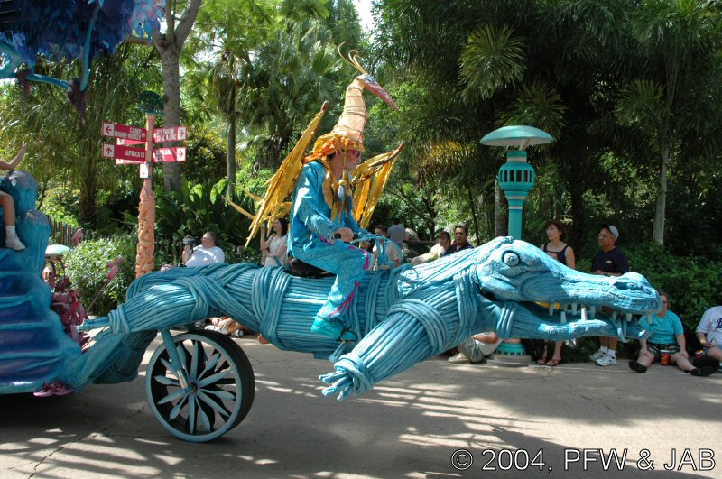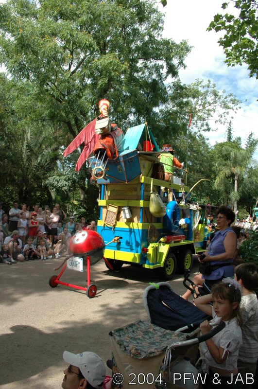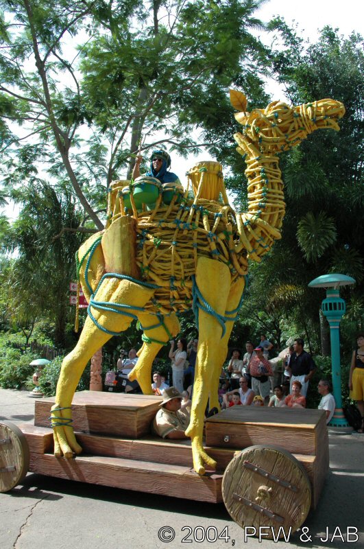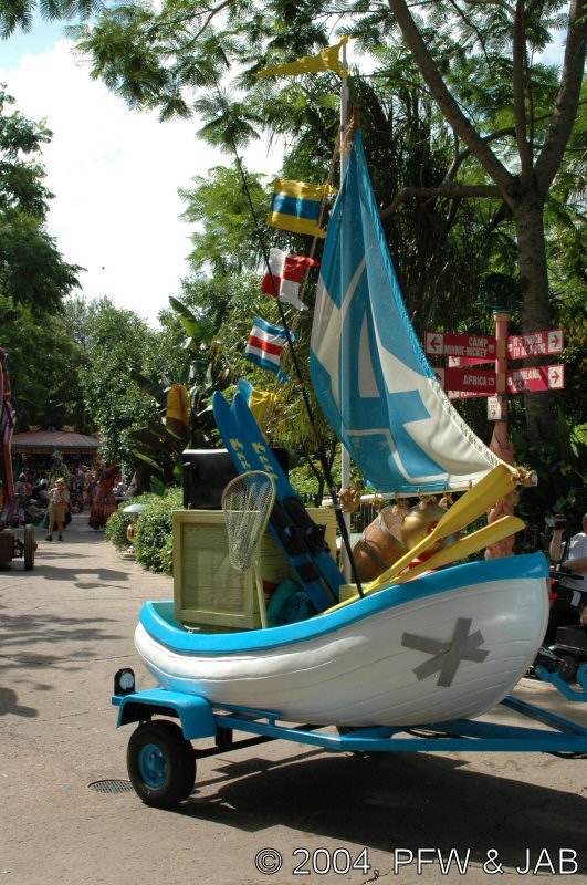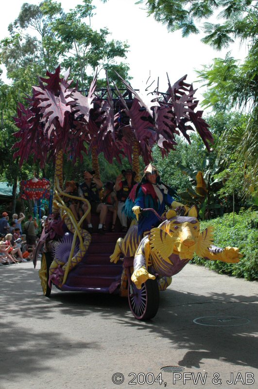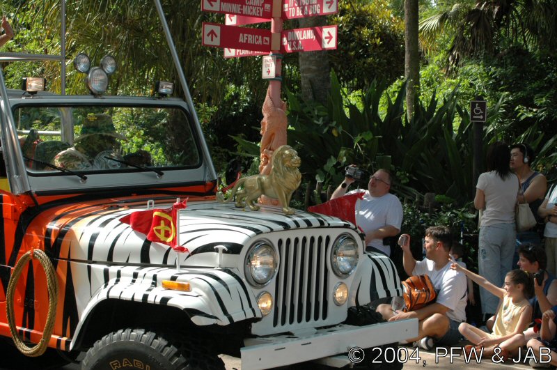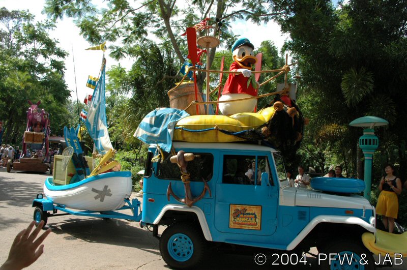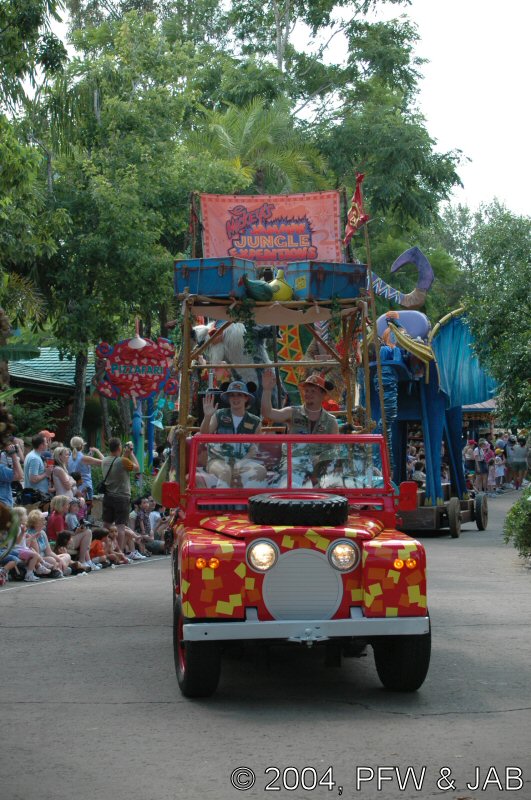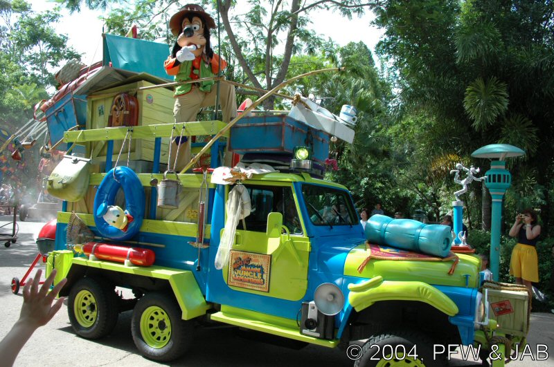 | Bon Voyage Caravan features a brightly colored jeep carrying Mickey Mouse. This jeep pulls a float consisting of several different safari-themed segments. The float carries Mickey Mouse and a guest family, which is selected daily to participate in the parade. |