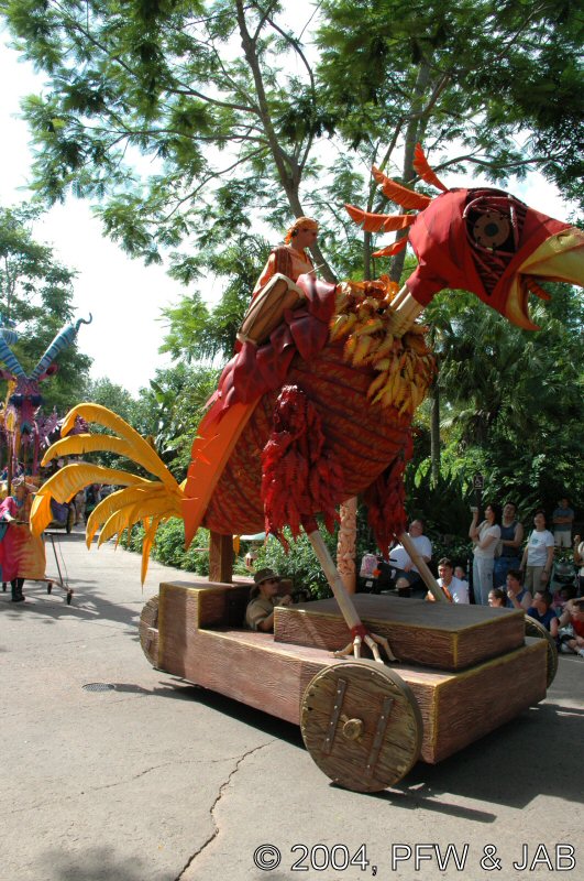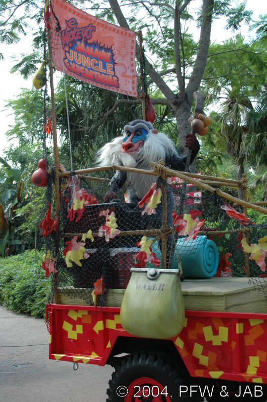 | Adventure Rover -- This opening rover is a brightly colored red, orange and yellow safari vehicle. It carries the beloved Disney character Rafiki, from the Disney animated film “The Lion King.” Rafiki rides with a guest family, which is selected daily to participate in the parade. |