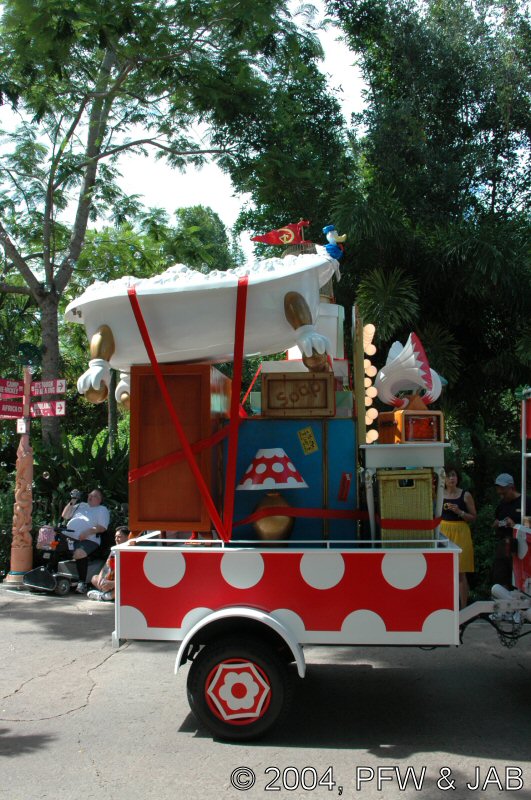 | Character Jeeps -- These three jeeps carry several of the most famous of all Disney characters including Minnie Mouse, Donald Duck and Goofy. The vehicles and floats are themed to the personalities of each character. Donald’s jeep pulls a float painted in various hues of blue with a sports and nautical theme. Minnie’s jeep and float are painted with her signature red and white polka dots adorned with a big red and white, polka dot bow. Goofy’s jeep and float feature a hodgepodge of items, ranging from oversized snowshoes to a pair of pajamas. |
