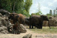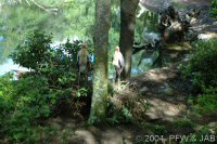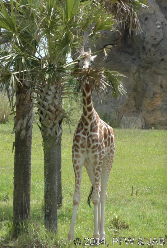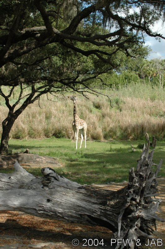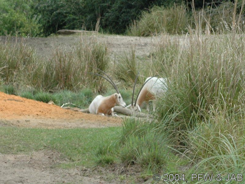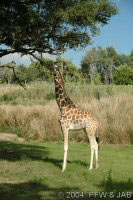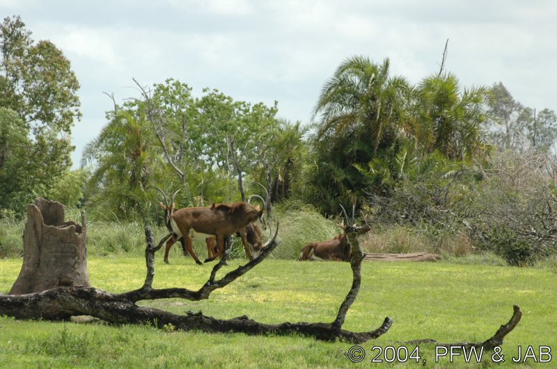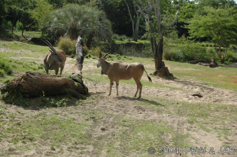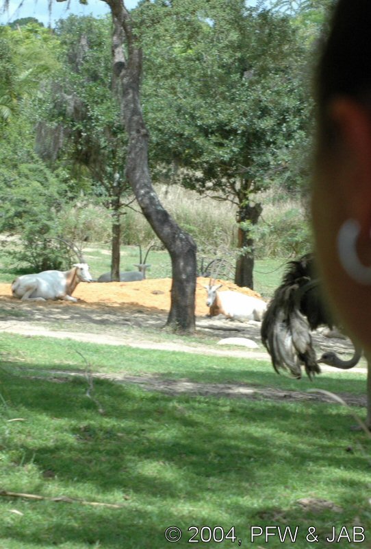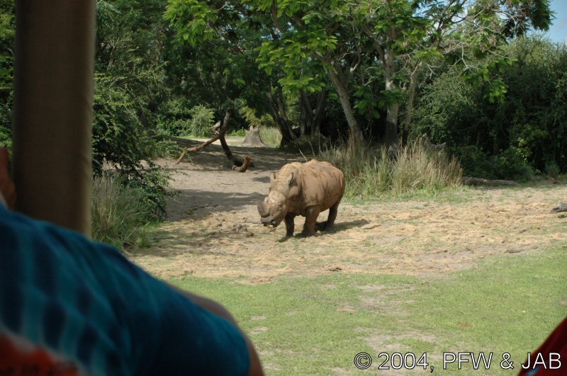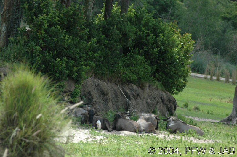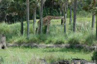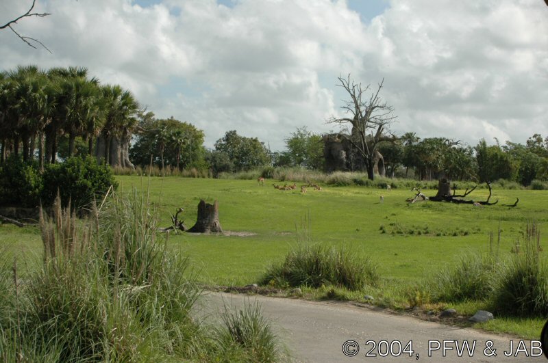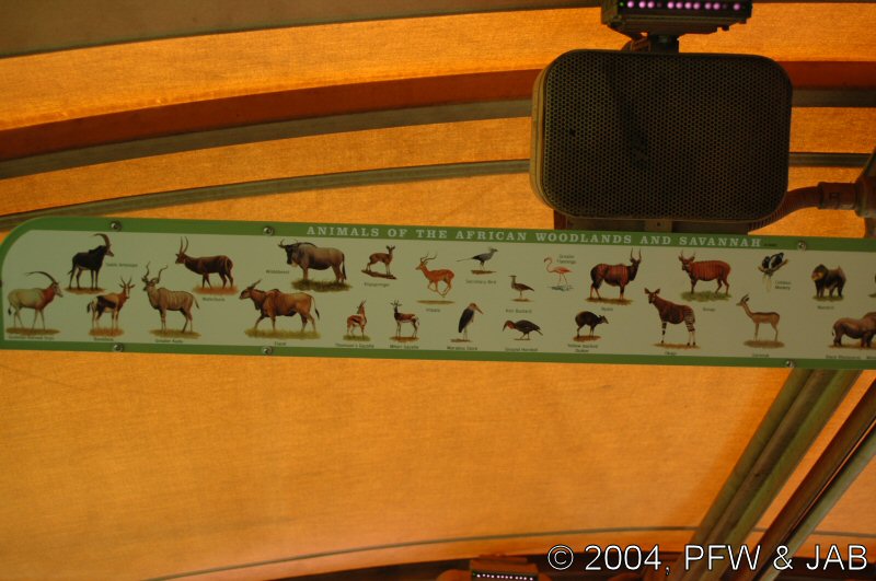 The ride vehicle is 8 feet off the ground enabling you to wind your way through the grasslands and waterways of the Savanah. 32 passengers fit in this all terrain truck with a driver for your guide. The drivers are trained to spot the animals along the Safari and point them out to you. Photography, however, is a challenge, as the vehicle stops momentarily at best. Some padding has been added to the seat bottoms and tops recently, a nice improvement from bumping along on hard plastic. Unfortunately when the padding was added, the photo identification charts of the animals was put overhead. This makes it very difficult for children to view. |