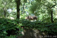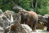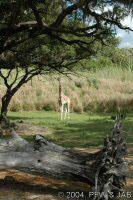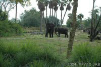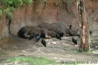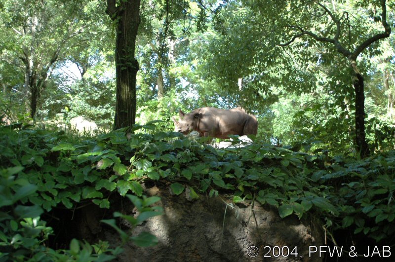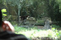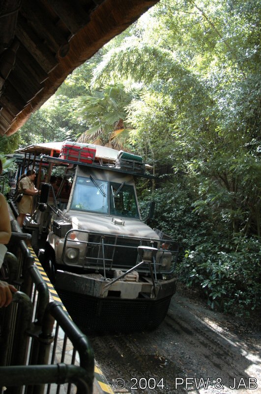 | Walking through the queue area you find yourself in the Harambe Reserve. Overhead TVs explain that poaching has killed many animals. Soon you arrive at the boarding platform, enter your jeep and head into the animal reserve. Your driver begins radio contact with a pilot....and off you and your jeep goes, down the bumpy dirt trail and into Africa! |