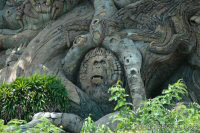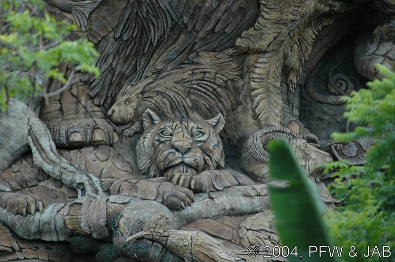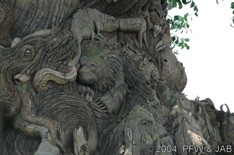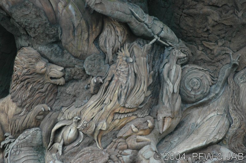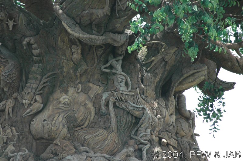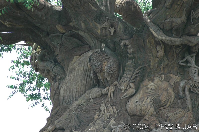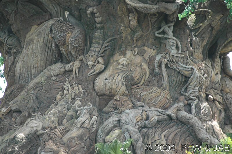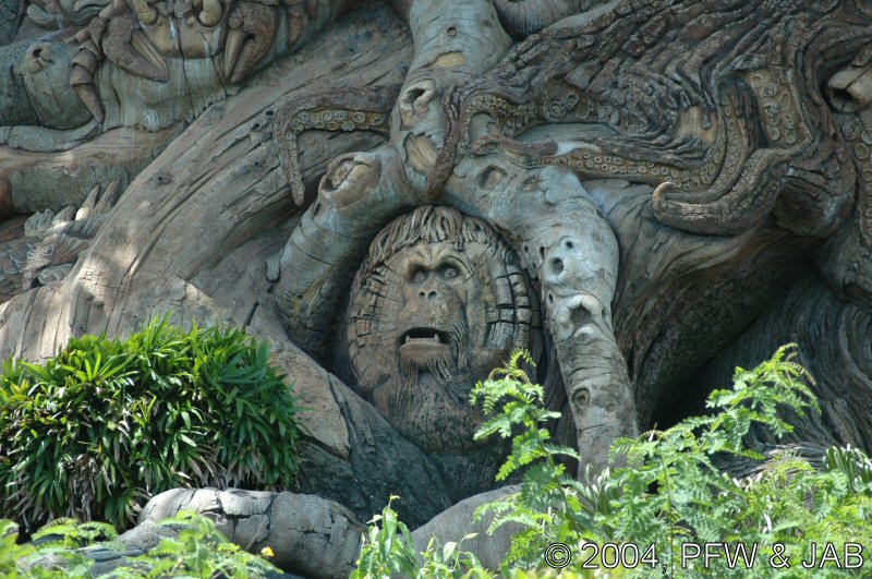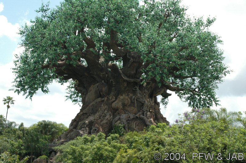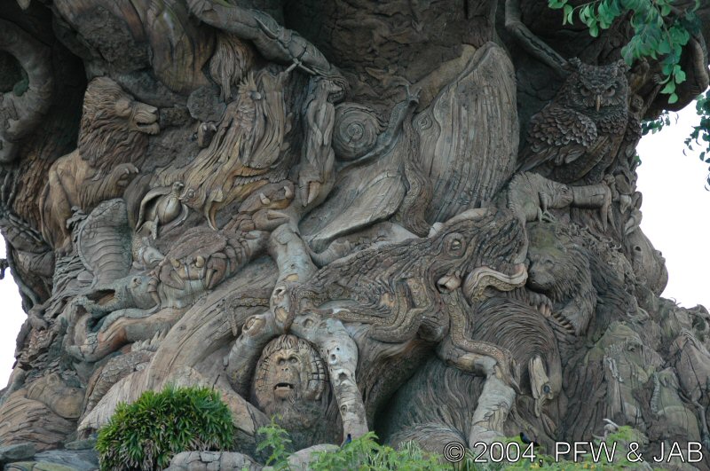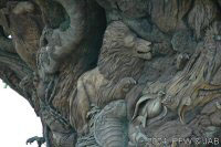 "The Tree of Life is a technological marvel, but it's also a symbol of the beauty and diversity and the grandeur of our animal life on Earth," says Joe Rohde, Walt Disney Imagineering vice president and executive designer for the park. "It's a celebration of our emotions about animals and their habitats." The Tree of Life roots find their way into the paths surrounding this magnificent Animal Kingdom icon. Surrounding the Tree of Life are the Discovery Island Trails - a quiet area of pools, meadows and trees that are home to flamingoes, otters, lemurs, axis deer, cranes, storks, tortoises and red kangaroos. As you wind your way through the tree roots, you find yourself at the base of the Tree of Life and the entrance to It's Tough to be a Bug theatre. TOURING TIPS : View the Tree of Life at different times during the day. As the sun and the shadows move you will see different animals appear. INTERESTING FACTS Today, the Tree of Life is made up of 45 secondary branches leading to 756 tertiary branches leading to 7,891 end branches with 102,583 green leaves (each more than one foot long). www.AllEarsNet.com |