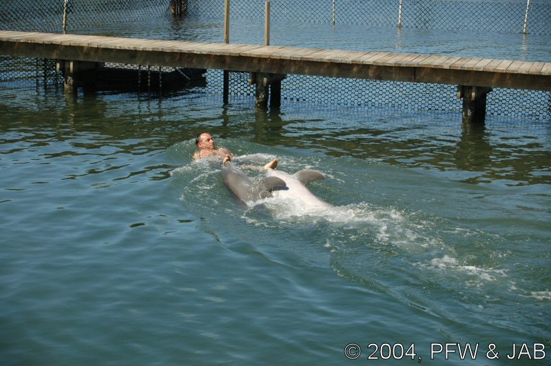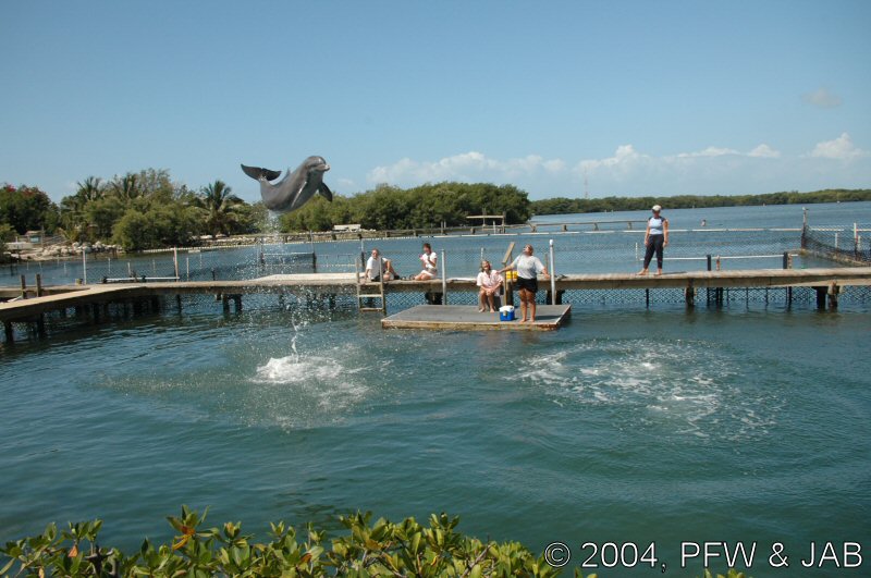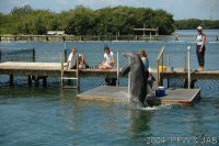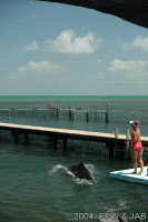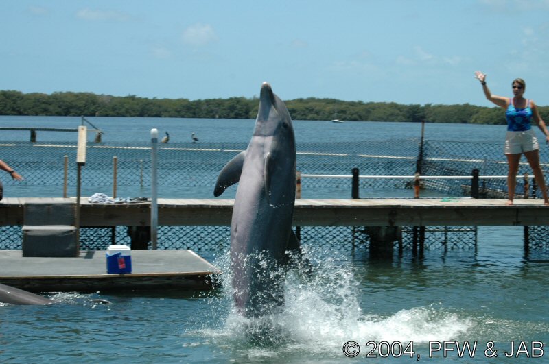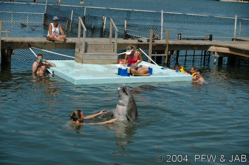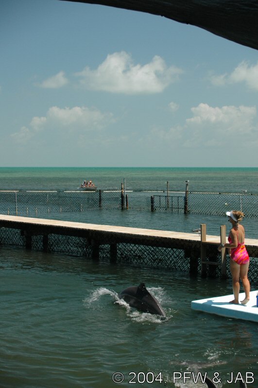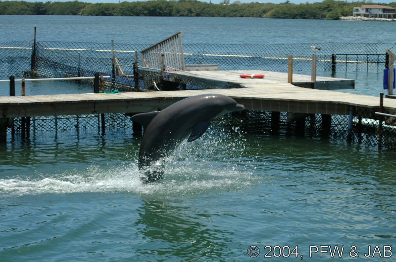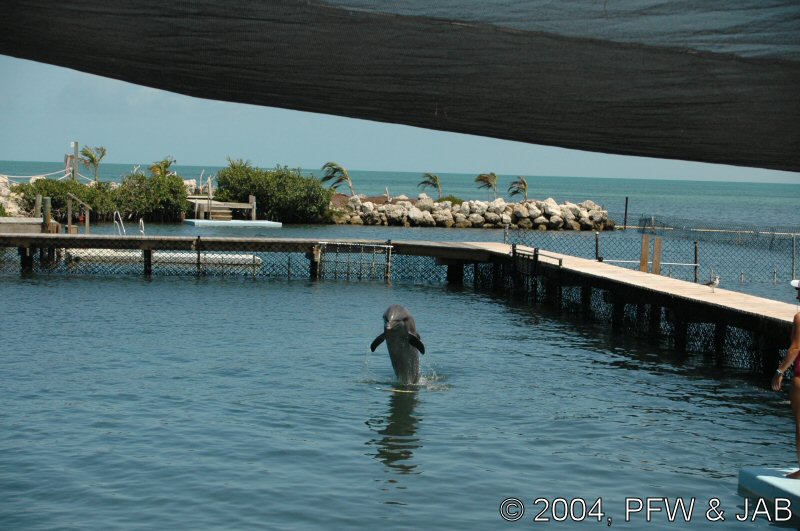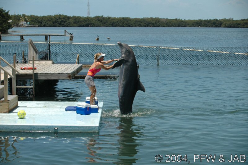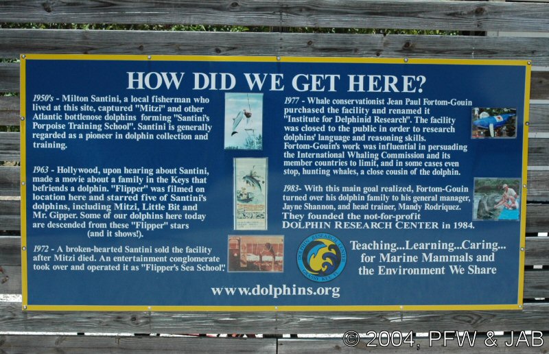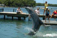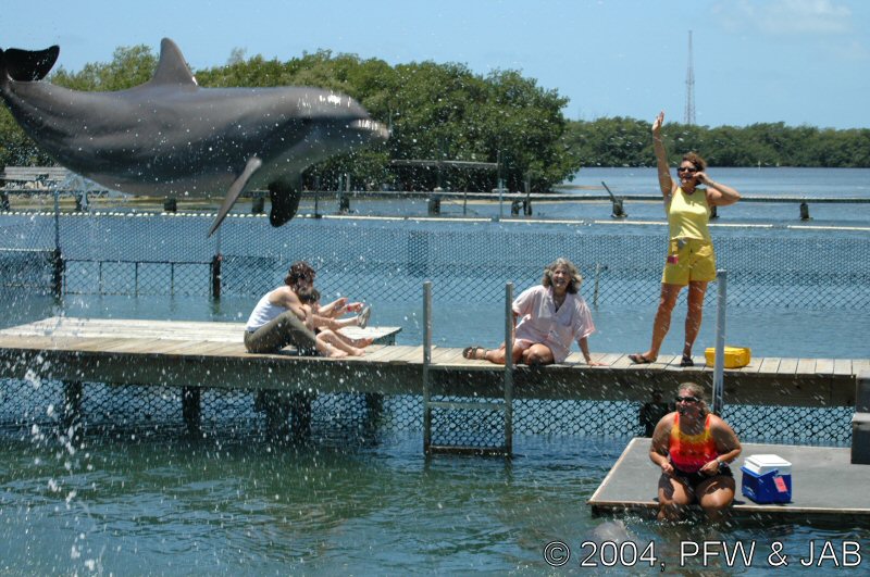 Op naar het Dolphin Research Center. Helaas was het zwemmen met dolfijnen helemaal volgeboekt, maar konden we nog wel terecht voor een dolphin splash: tot je middel in het water met een dolfijn. Het centrum is een non-profit organisatie, maar het onderhoud van dolfijnen is duur. Alle activiteiten zijn kleinschalig en dus ook duur. Daar staat tegen over dat je alle tijd krijgt en hebt. Hier kwamen oorspronkelijk de (vier) dolfijnen die 'Flipper' speelden in de TV serie vandaan. Een aantal van de huidige dolfijnen zijn nazaten van 'Flipper'. Voor een overzicht van de huidige dolfijnen, zie de volgende pagina: "meet the pod". |