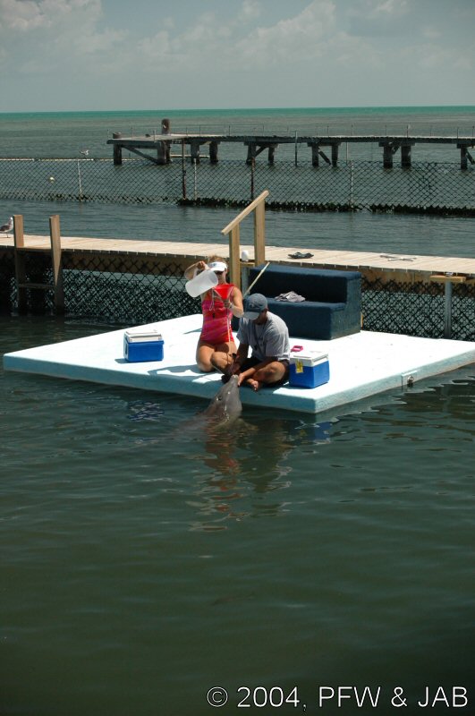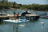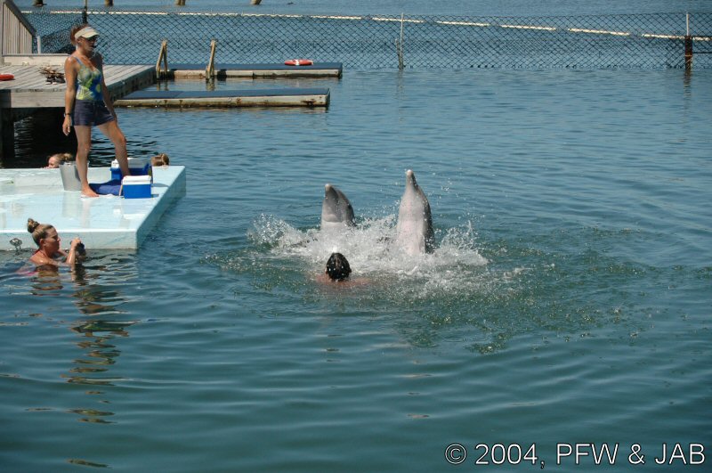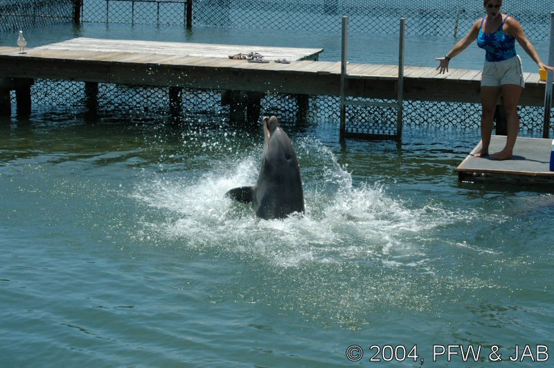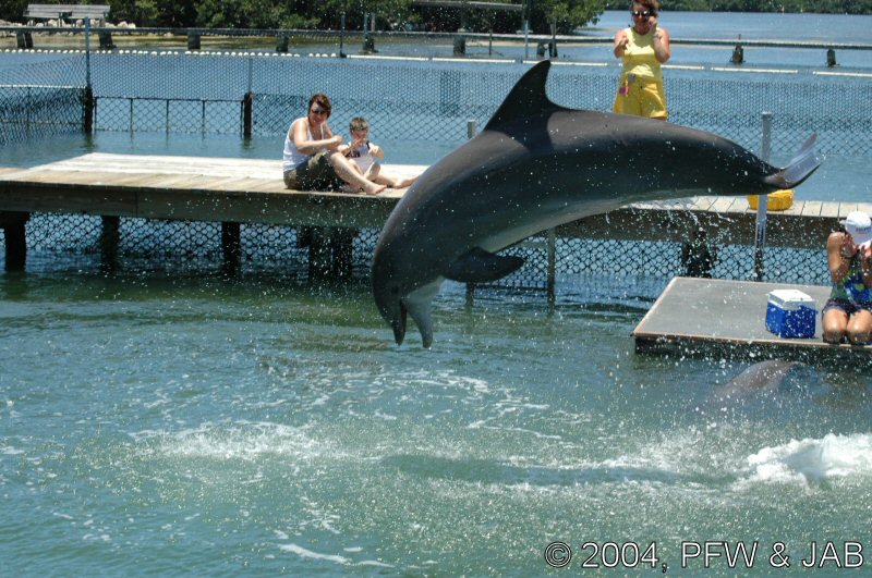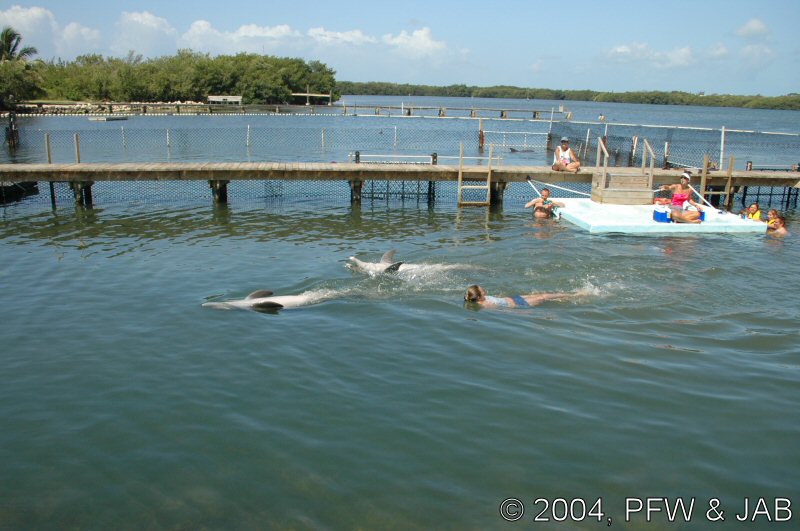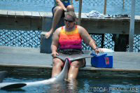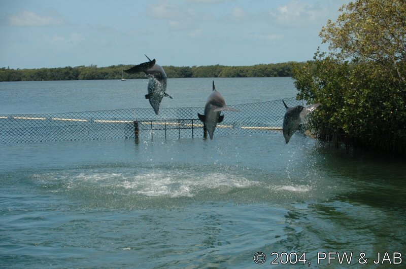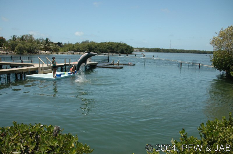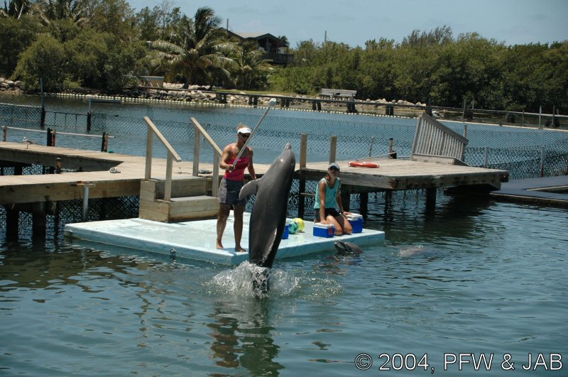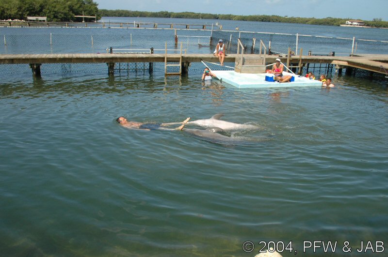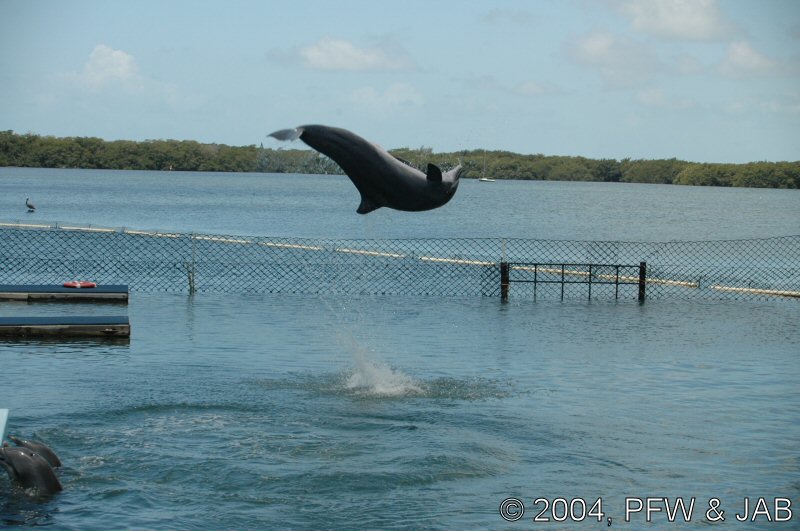 Op naar het Dolphin Research Center. Helaas was het zwemmen met dolfijnen helemaal volgeboekt, maar konden we nog wel terecht voor een dolphin splash: tot je middel in het water met een dolfijn. Het centrum is een non-profit organisatie, maar het onderhoud van dolfijnen is duur. Alle activiteiten zijn kleinschalig en dus ook duur. Daar staat tegen over dat je alle tijd krijgt en hebt. Hier kwamen oorspronkelijk de (vier) dolfijnen die 'Flipper' speelden in de TV serie vandaan. Een aantal van de huidige dolfijnen zijn nazaten van 'Flipper'. Voor een overzicht van de huidige dolfijnen, zie de volgende pagina: "meet the pod". |