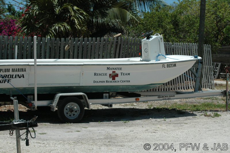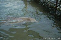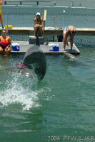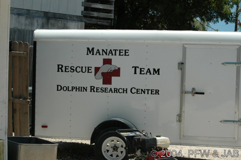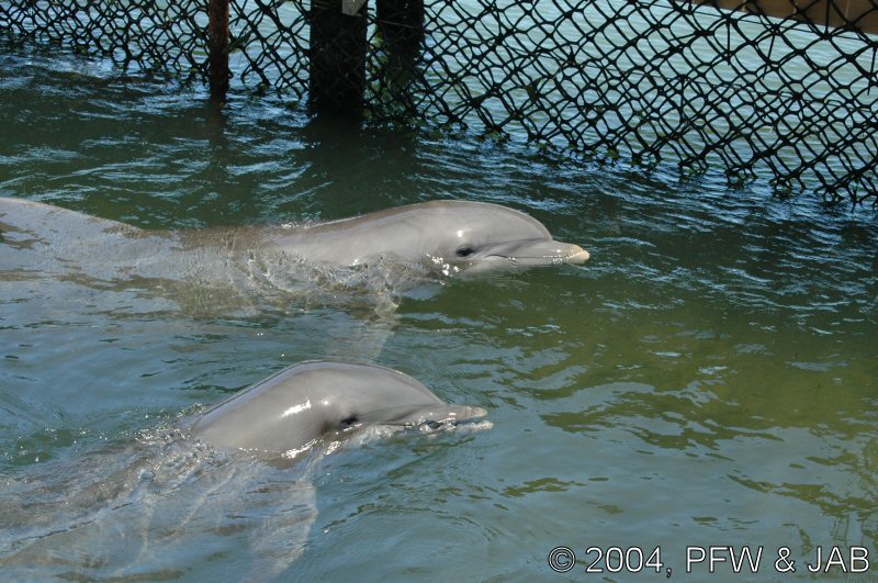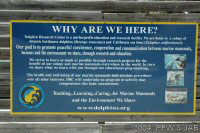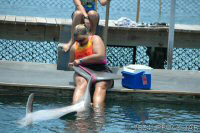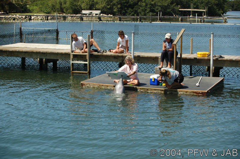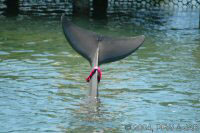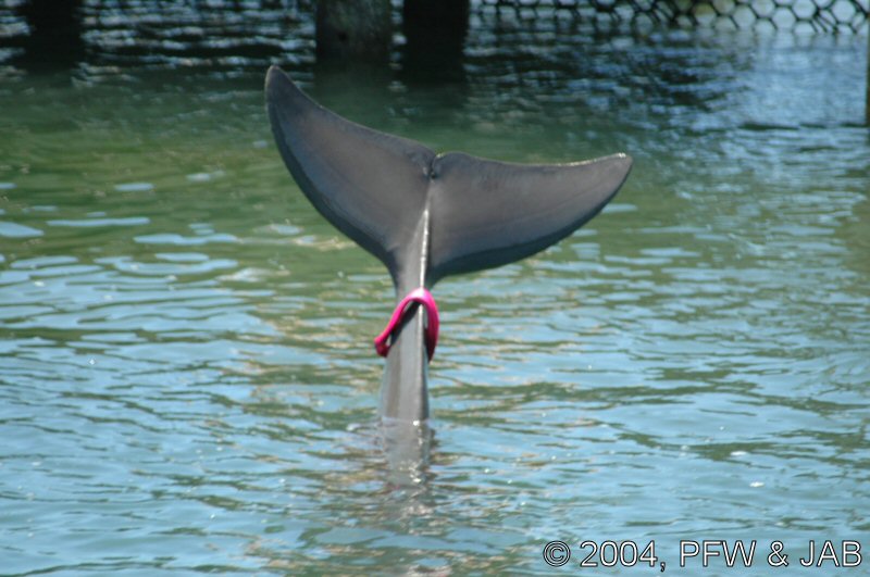 De dolfijnen worden langzaam gewend aan het dragen van een felgekleurde band rond hun staart. Dit heeft tot doel de dolfijnen duidelijk herkenbaar te maken indien in geval van nood (orkaan) ze in de ocean terecht zouden komen. Vissers kunnen dan zien dat het niet om een wilde dolfijn gaat. Bovendien kan er een electronisch volgsysteem in worden opgenomen. De kleur is niet hinderlijk: dolfijnen herkennen wel licht en donker, maar geen kleuren. Op de foto's is verder goed te zien dat het om een elastische band gaat. |