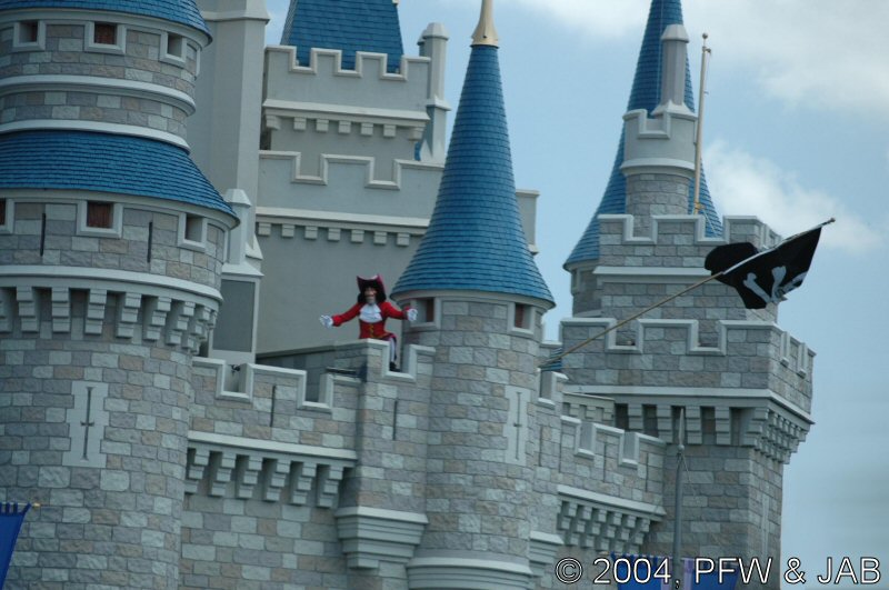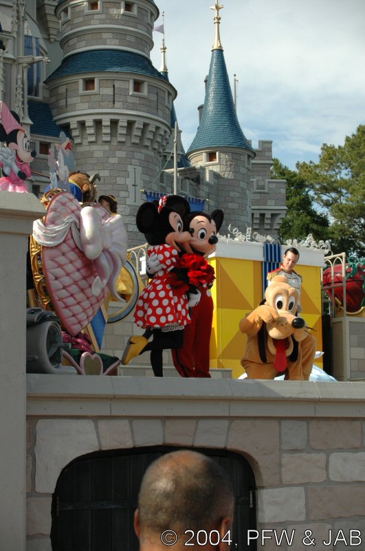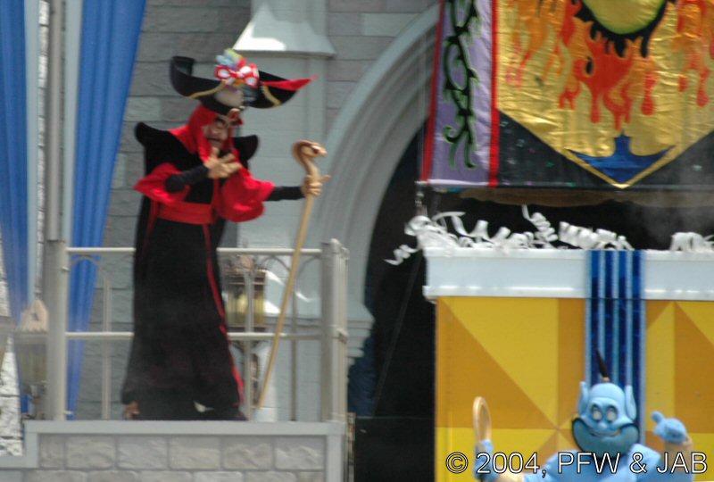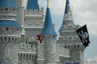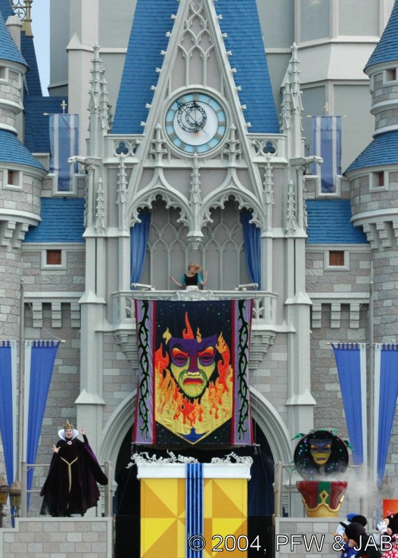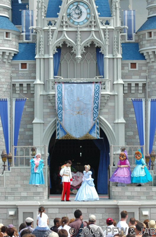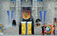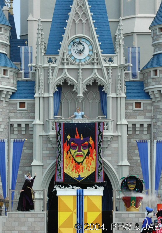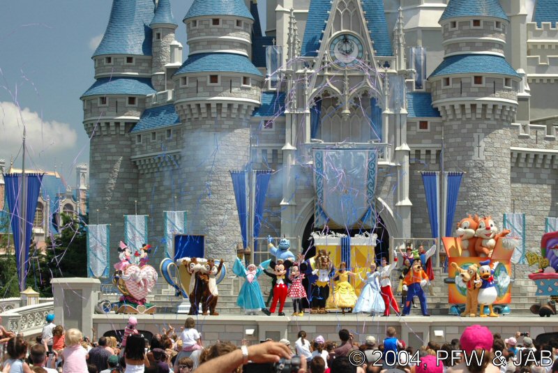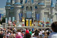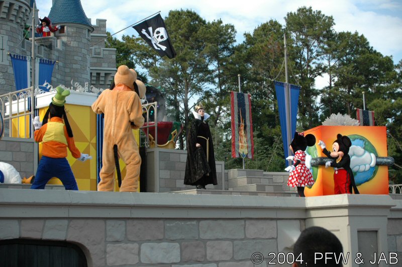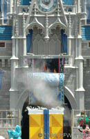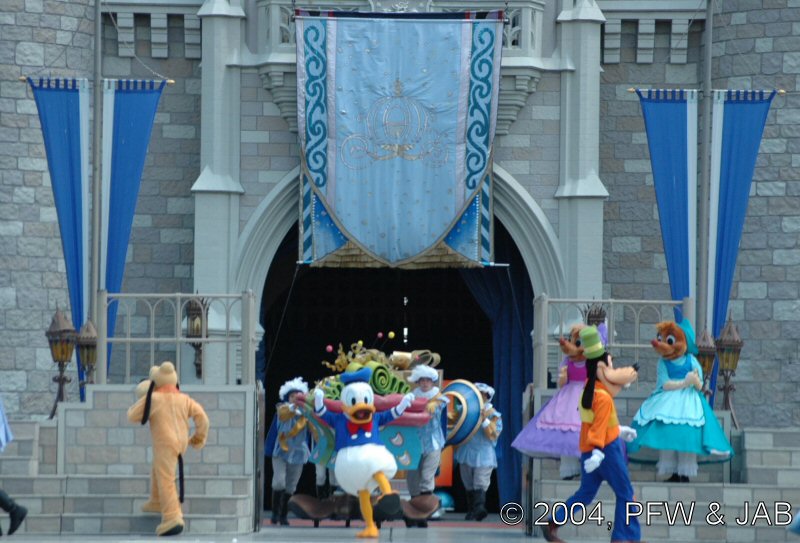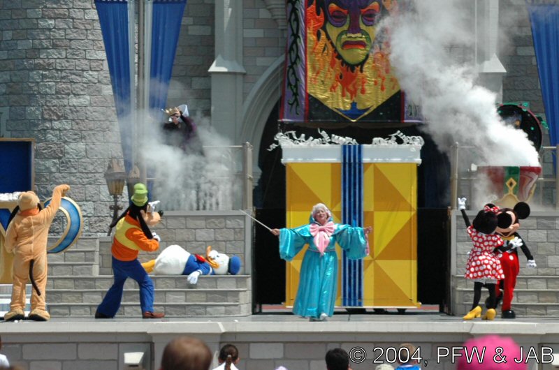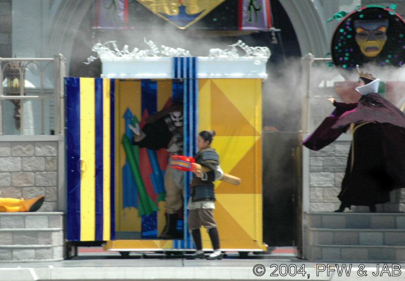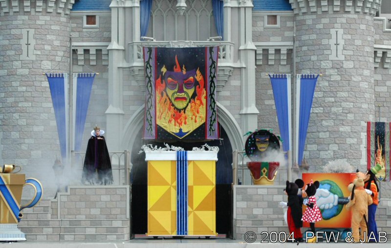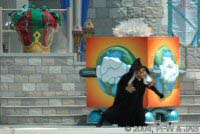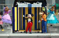 Gifts are brought on stage, including the Gifts of Romance and Laughter. But wait, the Old Hag suddenly appears with a gift of her own -- its an Apple! And she disappears as quickly as she appeared. There's lots of commotion around one beautifully wrapped gift! Here comes Mickey Mouse to join the party! Minnie opens the Gift of Romance for Mickey! The stage is filled with Belle and Beast, Snow White and Prince Charming, Cinderella and ....even Chip and Dale come out to join the celebration. But, Donald, just has to see what's inside the present wrapped like an apple, so he climbs up the stairs.Everyone shouts NO, Donald, NO! But he opens the gift anyway! Oh no, the Villains are taking over the Castle! It's Captain Hook and the Evil Witch! The audience has one final gift to open, the Gift of Courage! Peter Pan fights Captain Hook, Mulan comes to fight off Shan Yu, Genie fights Jafar, the spell on Donald is broken and everyone returns for a final celebration! At the end of the show, Cinderella invites everyone to meet their favorite Characters for photos and autographs! |
