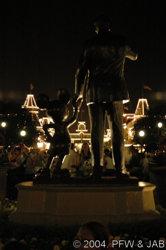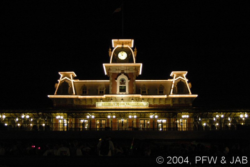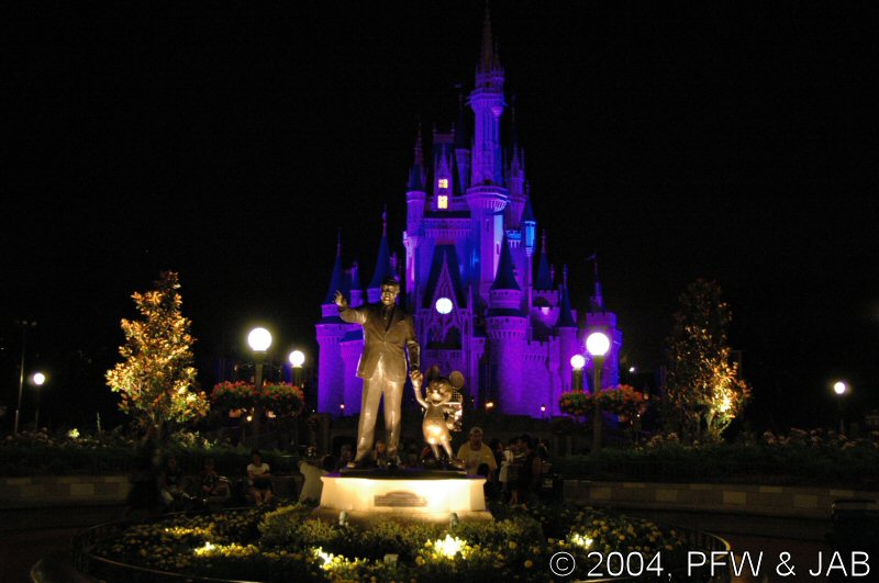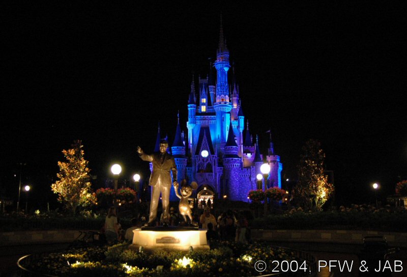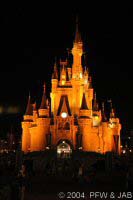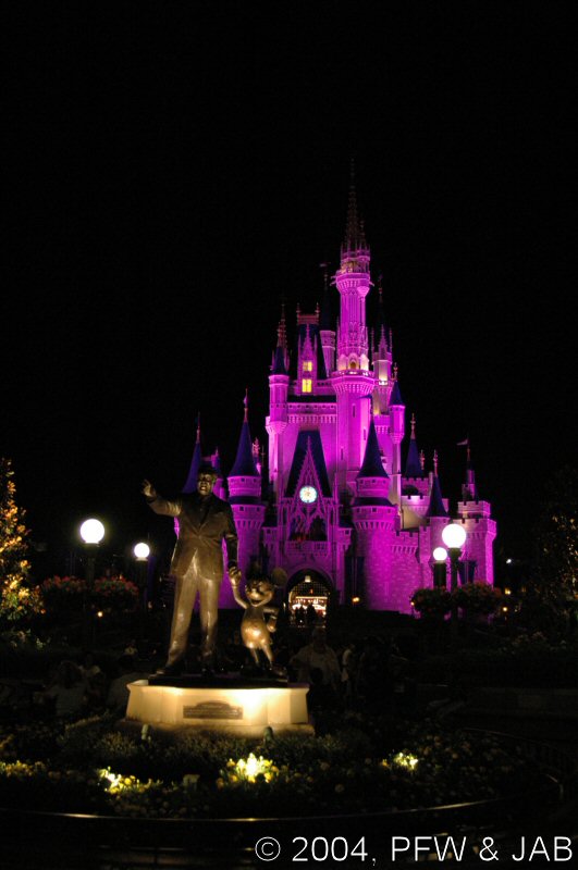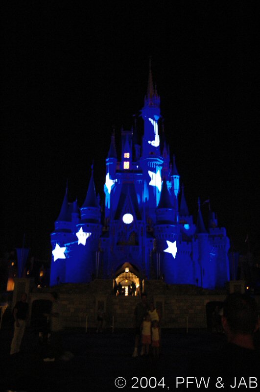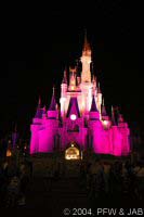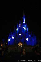 | Elke avond wordt na het vuurwerk de dag besloten met wat 'the kiss goodnight' is genoemd: Het kasteel wordt in slaap 'gekust' door het van kleur te laten veranderen. |