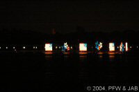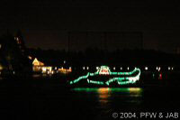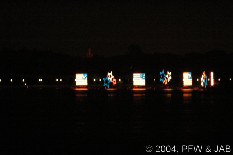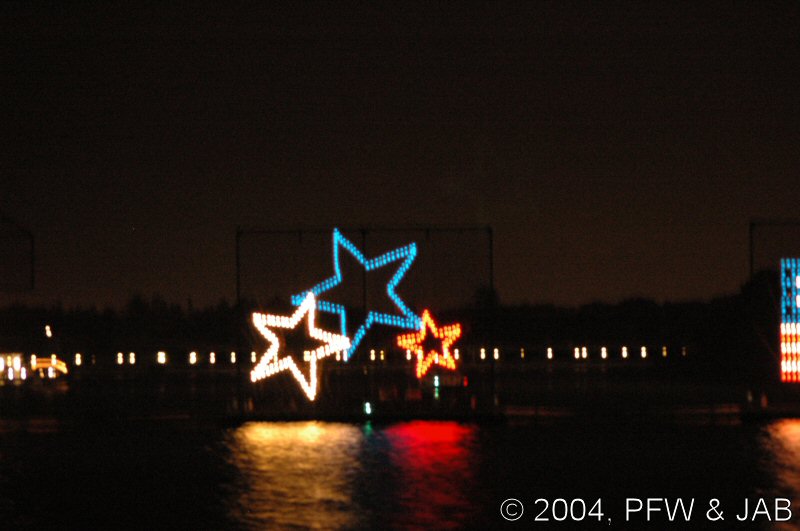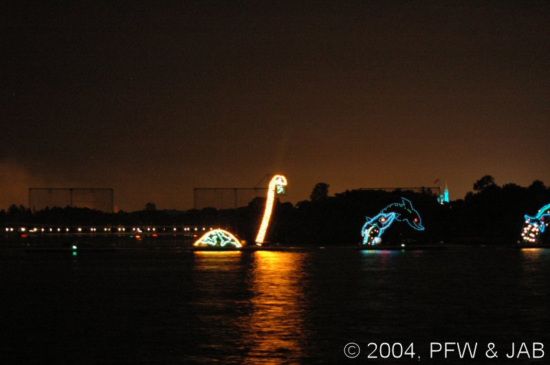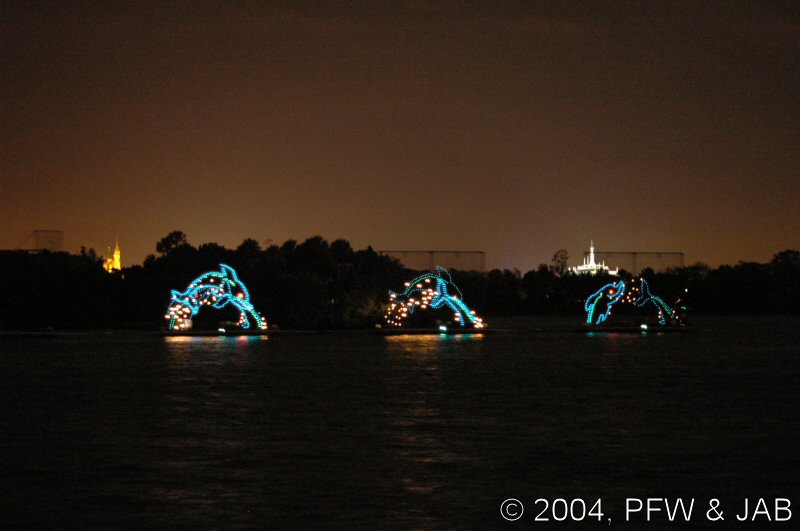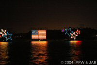The pageant consists of two strings of seven barges, each carrying a 25-foot-tall screen of lights featuring King Triton and creatures from under the sea -- turtles, whales, seahorses, even a sea monster! -- in an aquatic parade set to Disney and other classical music. Flags and Stars -- The pageant concludes with an inspirational salute to America, with Flags and Stars set to a patriotic musical score. It was originally presented for the dedication of the Polynesian Luau on October |