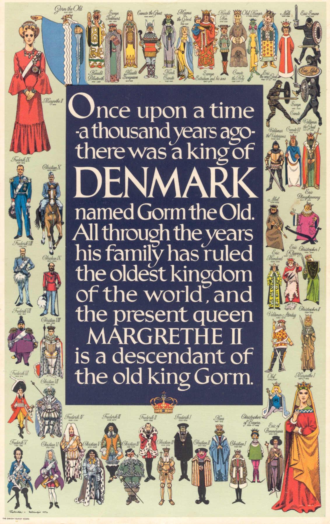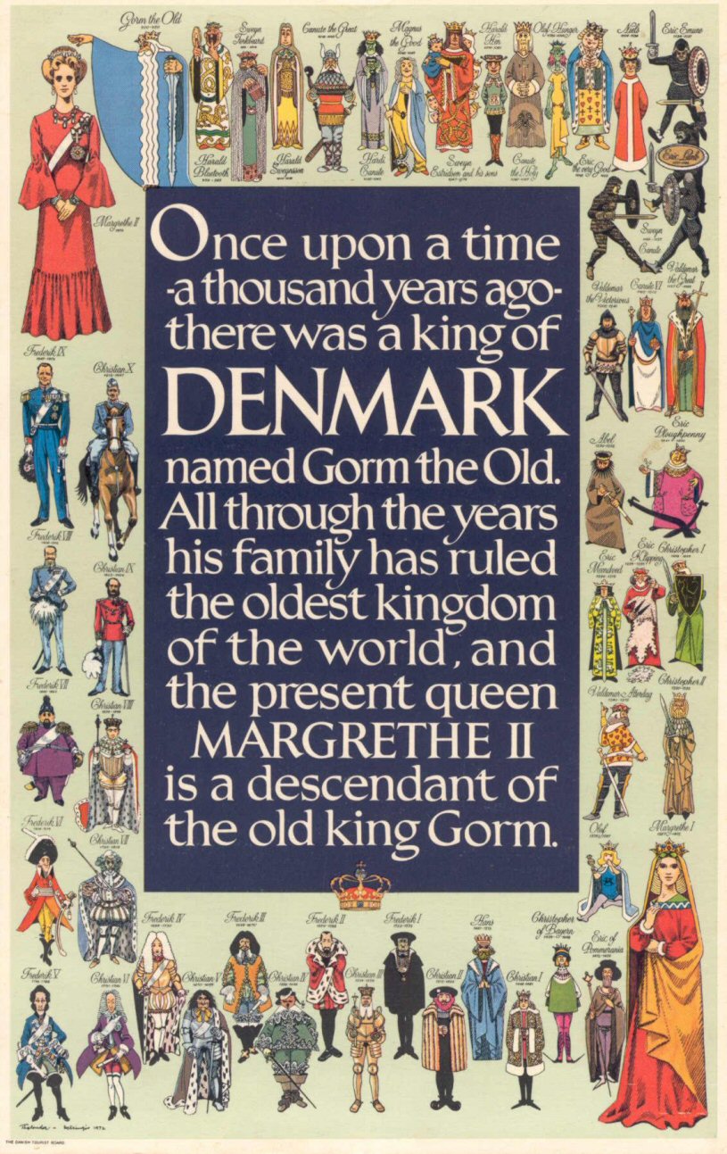Gorm the Old Harald Blatand Sweyn Forkbeard Harald Sweynssen Canute the Great Hardi Canute Magnus the Good Sweyn Estidse and his sons Hardi Hen Canute the Holy Olaf Hunger Erid the Very Good Niels Eric Emune Sweyn Canute Valdemar the Great Canute VI Valdemar the Victorious Erich Ploughpenny Abel Christopher I Eric Klipping Eric Maendved Christopher II Valdemar Attertag Olaf |