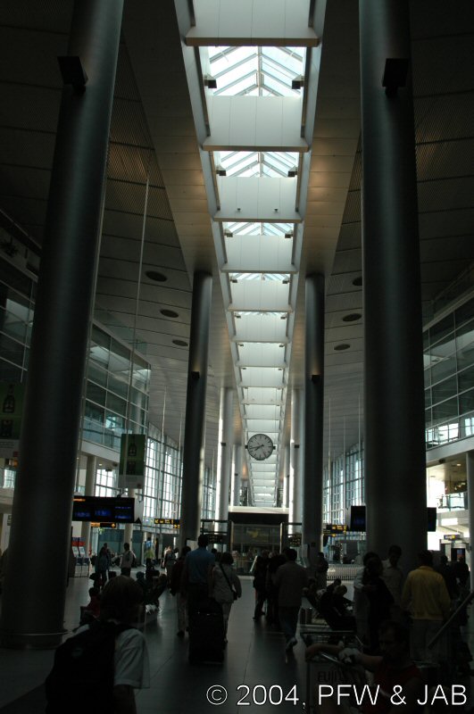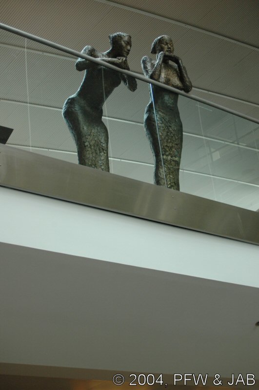 | Vliegveld Kastrup: moderne Deense architectuur, en boven de stroom aankomende reizigers staan deze dames op de uitkijk. |