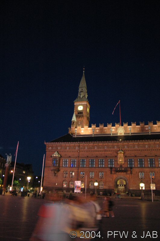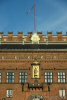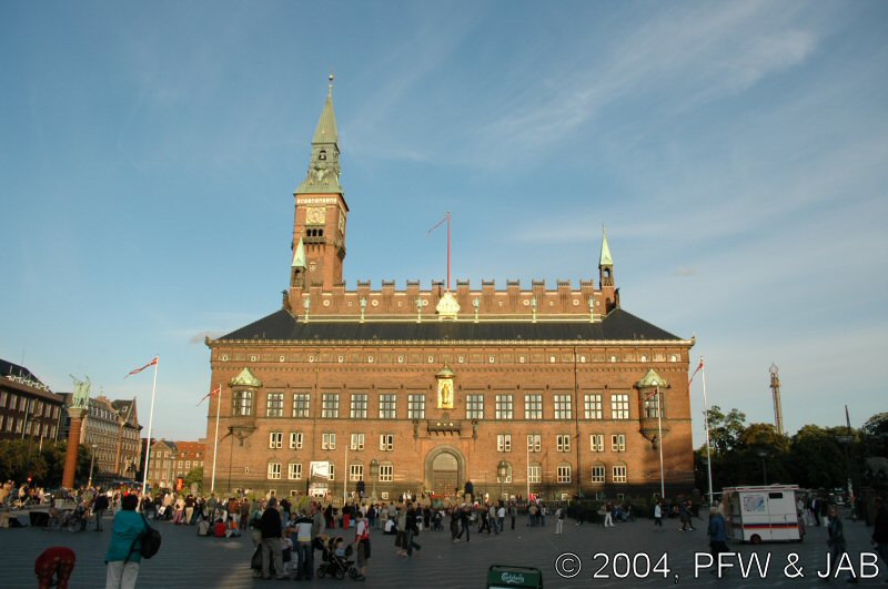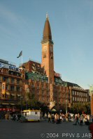 Radhusplatsen in de avondzon. Het Palace Hotel en het raadhuis, met in het midden een gouden relief van Bisschop Absalom, de stichter van Kopenhagen. Het raadhuis is gebouwd in 1902 naar ontwerp van de architect Nytrop, die zich liet inspireren door Italiaanse steden als Sienna. |