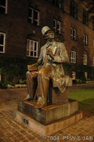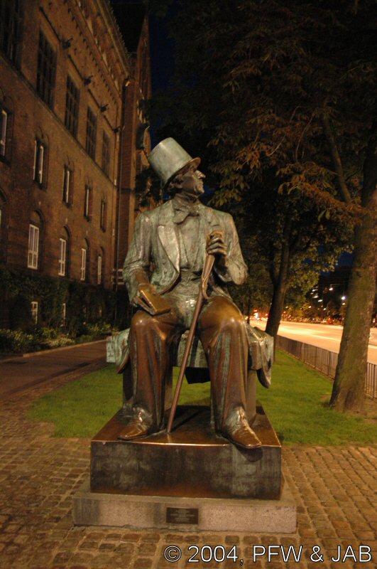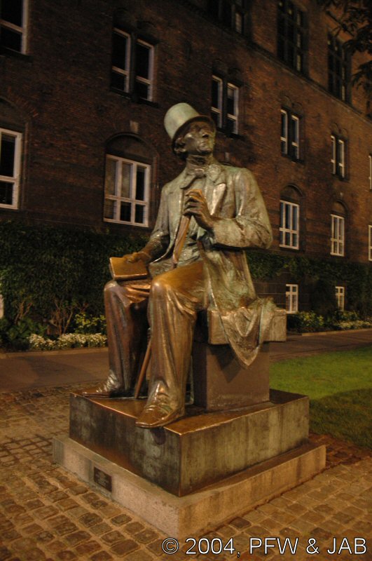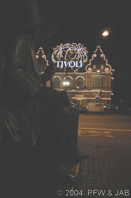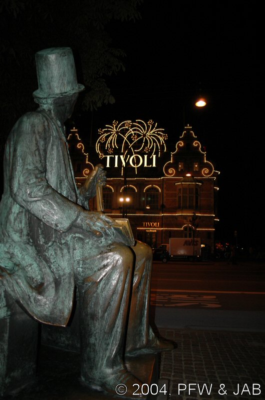 Hans Christian Andersen is te vinden. Hij kijkt uit naar een zijkant van Tivoli. |