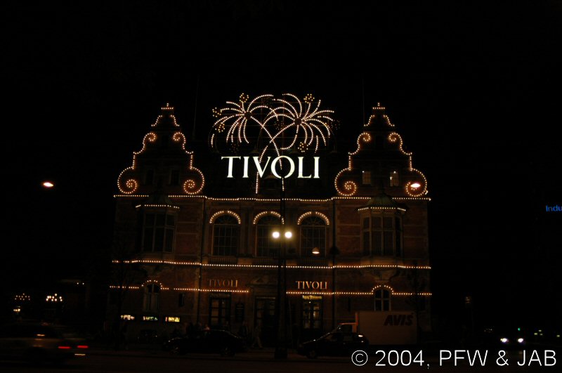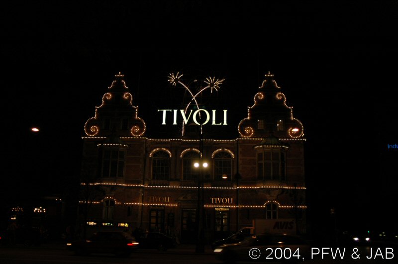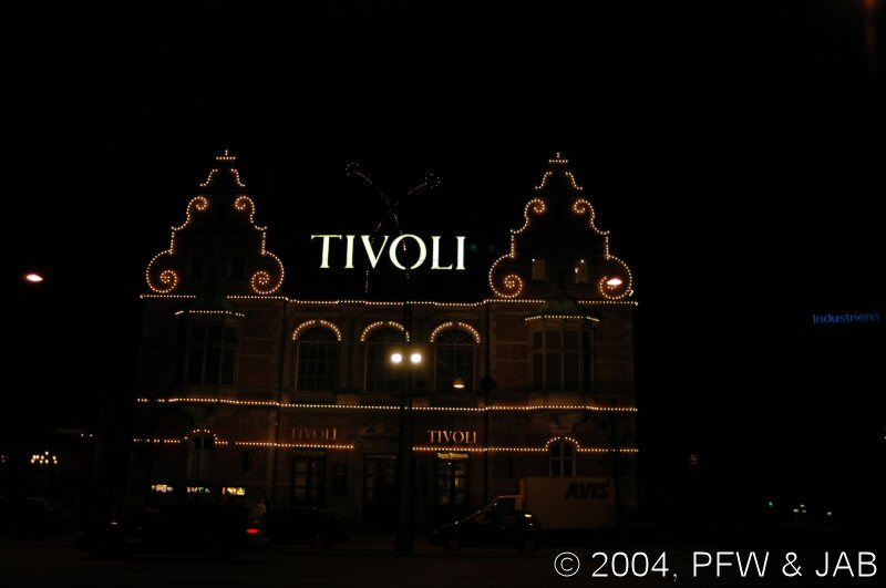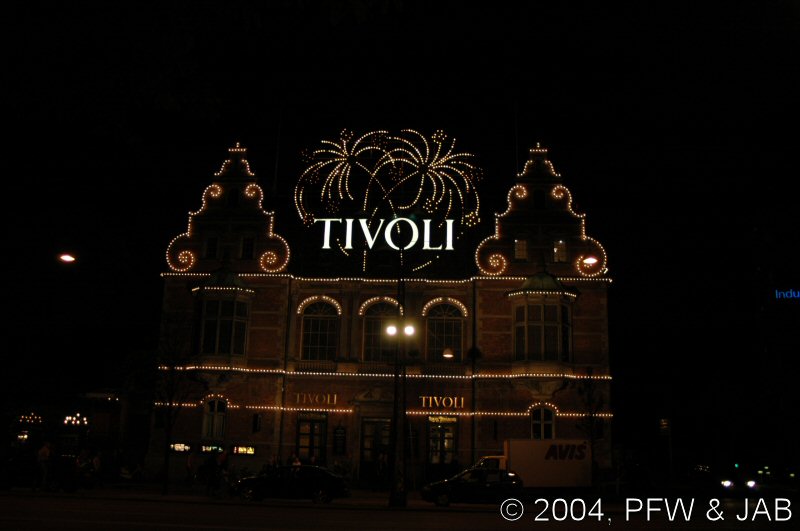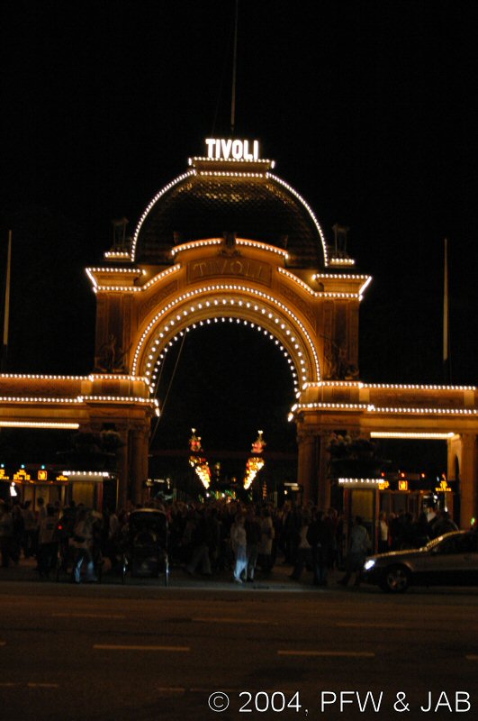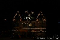 | Het is inmiddels al aardig laat geworden: nog even een blik op de hoofdingang van Tivoli, en dan naar het hotel terug. |