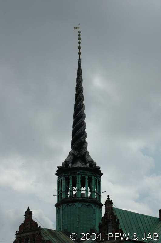 Toren van de beurs. Deze bestaat uit de gedraaide staarten van